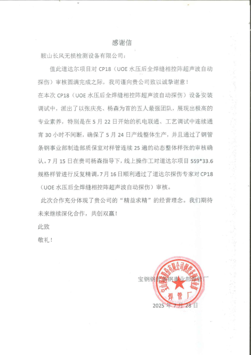 热烈祝贺“鞍山长风无损检测设备有限公司提供的全焊缝相控阵超声波检测设备,2025年07月16日助力宝钢UOE产线顺利通过道达尔标准审核!”